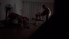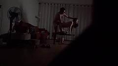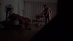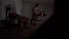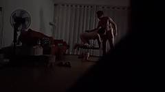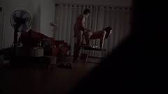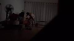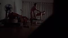 Esta gata asiática está numa pequena mesa a desfrutar de uma boa foda em posição de cãozinho. Ainda pega boquete para ajudar na tesão.