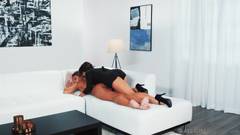 A vagabunda tem seus ombros massageados por uma milf morena, elas se esfregam, se beijam, se acariciam e lambem a buceta uma da outra.