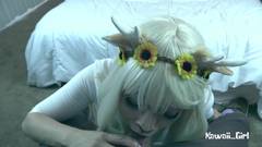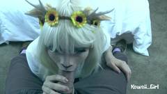 Este teennum cosplay kawaii chupa seu pau com gosto. Lambendo sua glande enquanto ela devora suas bolas. Ela usa a garganta profunda dele e o faz ejacular.