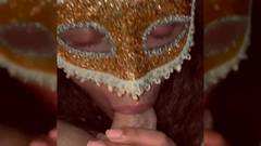 Morena excitada usando uma máscara para cobrir seu comportamento de vadia chupando o pau de um estranho na POV.