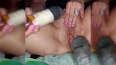 A namorada dele está deitada na cama e abre as pernas para mostrar a buceta molhada e ele começa a enfiar vibradores enormes dentro dela