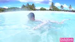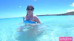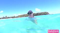 Transa arriscada em público na frente de estranhos numa praia - casal em férias se diverte e ele goza dentro da sua bucetinha doce e a enche de porra