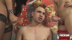 Esse cara está prestes a passar um momento maravilhoso, não com não uma, mas com duas transexuais que estão aqui para cuidar de seu pênis.