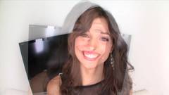 Uma morena sexy e bonita parecendo tão feliz com um grande sorriso no rosto, sabendo que vai experimentar tudo o que ama