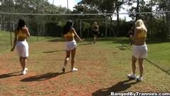 O árbitro dessa partida de vôlei tem uma oportunidade única de agradar os dois times com seu próprio cu e boca! As garotas transexuais ficarão encantadas.