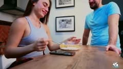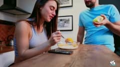 Um casal de amantes se diverte depois de uma refeição e, na mesma mesa, eles se entretêm chupando pau em diferentes posições.