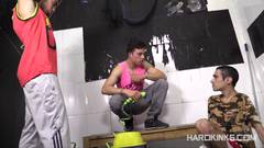 Depois da academia, esses dois fodedores se divertem com seu parceiro nerd, humilhando-o, cuspindo e mijando nele. Eles adoram um submarino!