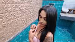 Aumente a temperatura com Louise Rios, uma transexual com um pau grande, que chupa um pau dentro de uma piscina e é fodida.