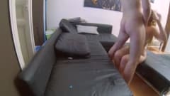 Uma vagabunda de cabelos compridos e seu homem excitado fodem num sofá de couro em várias posições profundas, sem saber que estão sendo filmados.