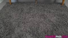 Uma mulher com peitos grandes e uma bunda grande se dedilha e, em seguida, um homem bonito tira um pau grande dela e se delicia generosamente com ele.