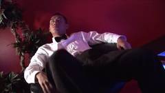 Uma loira de vestido vermelho e renda faz um striptease na barra e é pega por todos os orifícios no palco