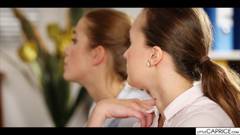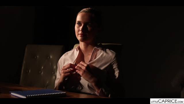 Stacy transa com seu colega debaixo da mesa no meio de uma reunião de negócios e se imagina oferecendo-se a ele em lingerie fina na cadeira do escritório.