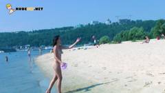 Essa nudista caminha e brinca na praia. Ela adora exibir seu corpo fabuloso e deixar nós, observadores, com tesão!