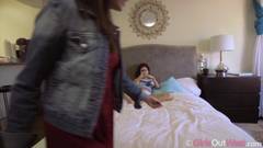 Cansada de sua viagem, uma morena reclama com a amiga, sem perceber que a amiga, com calor na buceta, já está se tocando.