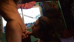 O cara está ali, tendo seu pênis chupado por sua linda namorada. Ela lhe faz um boquete até que ele derrame suas bolas no rosto dela.