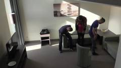 Morena com uma grande tatuagem tem dois caras na cama. Ela chupa seus paus e os fode em diferentes posições com os dois ao mesmo tempo até gozar.