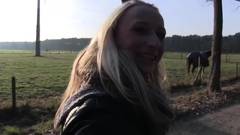 Uma jovem loira passeia por uma fazenda com seus cavalos e mostra ao rapaz sua bunda apetitosa. Eles voltam para casa para transar depois.