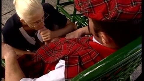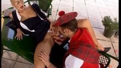 Esta porno star loira é uma puta que não consegue resistir a artistas escoceses, por isso ela arranca seu kilt e chupa seu pênis profundamente!