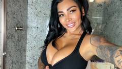 A bela latina, morena, com peitos e bunda grandes, tem o corpo coberto de belas tatuagens e está ansiosa para exibir esse tesouro e se masturbar.