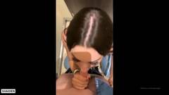 Uma morena se ajoelha na frente de um cara e chupa seu pau. Ela tem uma garganta muito profunda e sabe que vai ajudar seu amante a esvaziar suas bolas