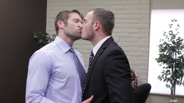 No escritório, Christian Wilde e Colby Keller fazem amor e terminam por gozar ao mesmo tempo, com as gravatas postas e as picas duras!