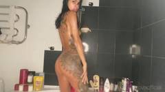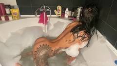 Uma jovem com seios pequenos está tomando banho na banheira e começa a dedilhar sua buceta sedenta de sexo, e também experimenta com a bunda.