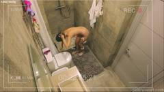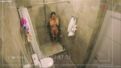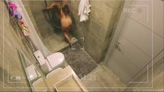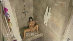 Uma câmera no banheiro filma uma jovem morena tomando banho, o que a excita tanto que ela começa a se masturbar.