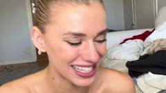 Loira amadora, filmada em close-up enquanto chupa o pênis grosso de seu amante, bem no fundo de sua garganta até que ele espirre em seu rosto.