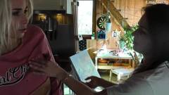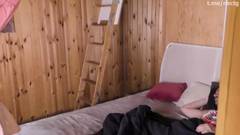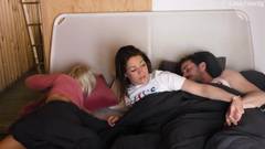 Uma loira magra seduz o marido de sua amiga morena com sua buceta lisinha e depilada depois que os três dividem a cama.