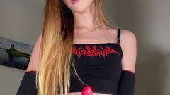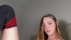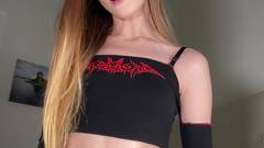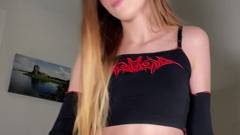 Uma jovem amadora em uma roupa minúscula mostra sua buceta rosa e nos conta como ela masturba um pênis.