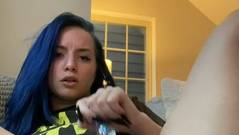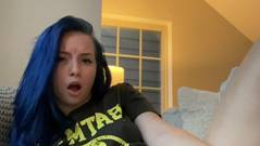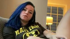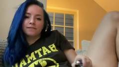 Garota amadora safada com cabelo azul e camiseta do Batman masturba sua buceta para seus fãs nerds leais.