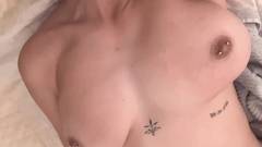 Não perca essa linda garota, com peitos empinados, dedilhando sua buceta, nua, enquanto está deitada.