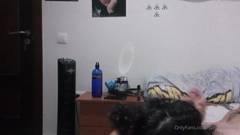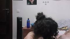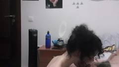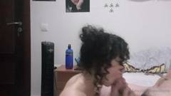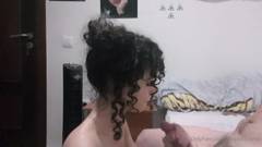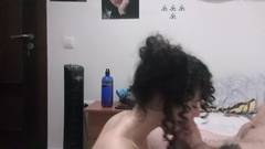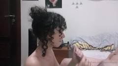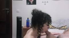 Garota cacheada, chupa um pau grande e engole até a última gota, seu homem ejacula em sua linda boca de puta.