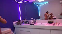 Cabeleireiro nu, corta o cabelo de Yuri Oberon, chupa seu pau e também tem seu pau longo chupado.