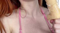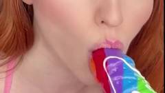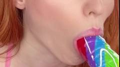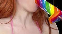 Garota sedutora, com cabelos ruivos e peitos grandes, provoca você com suas habilidades de chupar pênis. Ela adora seu pirulito em forma de pênis!