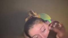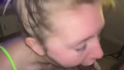 A garota loira prende o cabelo para se ajoelhar e chupar um grande pau preto, sem parar até que ele goze em sua boca.
