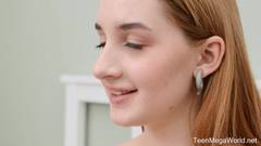 A jovem ruiva de cona rosada, Eva Tender está sozinha em sua cama