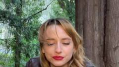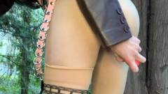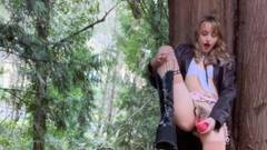 Essa amadora magra e de pernas longas fuma e masturba sua buceta peluda com um brinquedo sexual no bosque, perto de uma grande árvore, filmada!