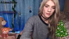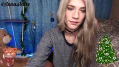 Uma transexual atraente, loira e magra, com um pau grande e um rosto bonito, está na frente da câmera, chupando um vibrador grande e se masturbando.
