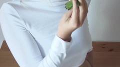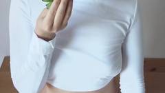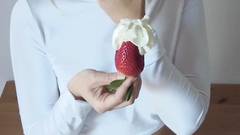 Jovem loira praticando suas habilidades de felação com o strawberrycchia! O chantilly representa o sêmen e o gosto em sua boca a excita