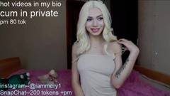 Travesti loira com seios grandes, tatuagens e cabelos loiros, masturba seu pau para a câmera.