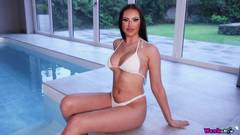 Kya Rose mantém seu biquíni branco e exibe seus peitos grandes e sua buceta depilada nesse vídeo.