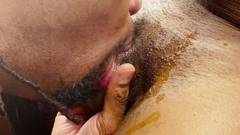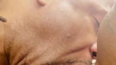 Um homem negro enche o olho do cu de um homem com saliva e o chupa até que ele esteja pronto para ser golpeado por seu grande pênis negro.