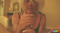 Trans madura com uma peruca loira, chupa meu pau em POV e me deixa perfurar sua bunda por trás.