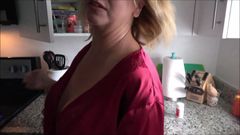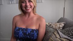 Brianna Beach, uma loira excitada com peitos grandes, chupa um pau grande, usa seus peitos para masturbá-lo e o cavalga até ele gozar.