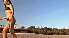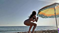 Uma morena sexy em um traje de banho faz alguns exercícios físicos em frente à webcam na praia! Ela quer excitá-lo fazendo um agachamento!