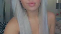 Uma loira etérea e sexy, usando meias brancas, levanta as pernas bem alto na frente da câmera e masturba sua boceta depilada com um grande vibrador.