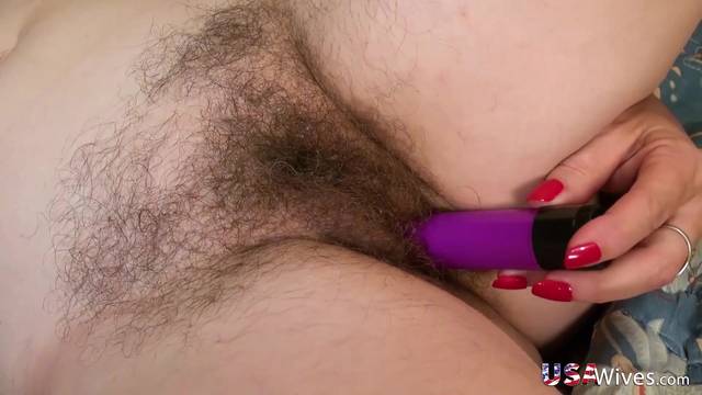 Parece que é um ninho de pássaros, mas não, é a buceta peluda de Carmen que se masturba com seu grande dildo roxo, ela gosta de fazer isso na sua cama.