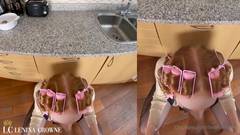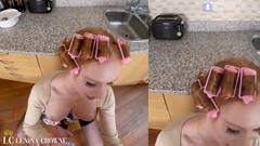 Uma jovem esposa com cachos na cabeça chupando o pau de seu esposo na cozinha e, em seguida, encostada no balcão da cozinha, recebe uma foda profunda.