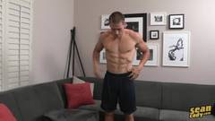 Sam se despe, acaricia seu pênis incansavelmente e goza em todo o sofá, neste vídeo, para nosso prazer.